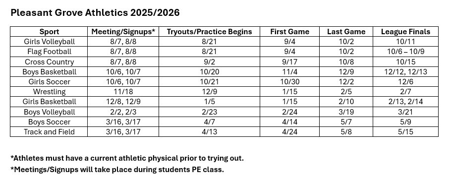 Pleasant Grove Middle School offers a full range of athletic opportunities after school.  Students of all grade levels are eligible to participate in cross-country, flag-football, volleyball, soccer, basketball, wrestling and track. Students are not required to tryout for cross-country or track. Teams participate against other middle schools from within the El Dorado County Sports League.